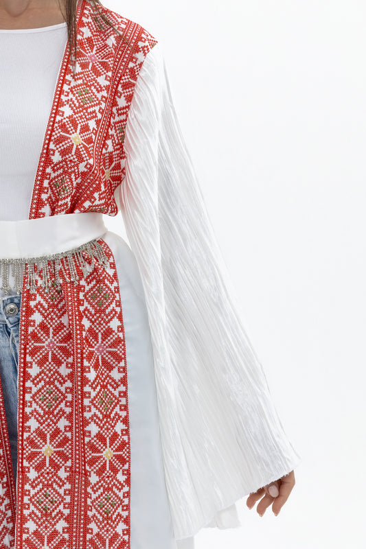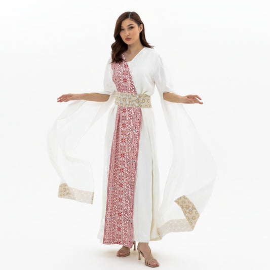 White Abaya with Red Palestinian Tatreez
