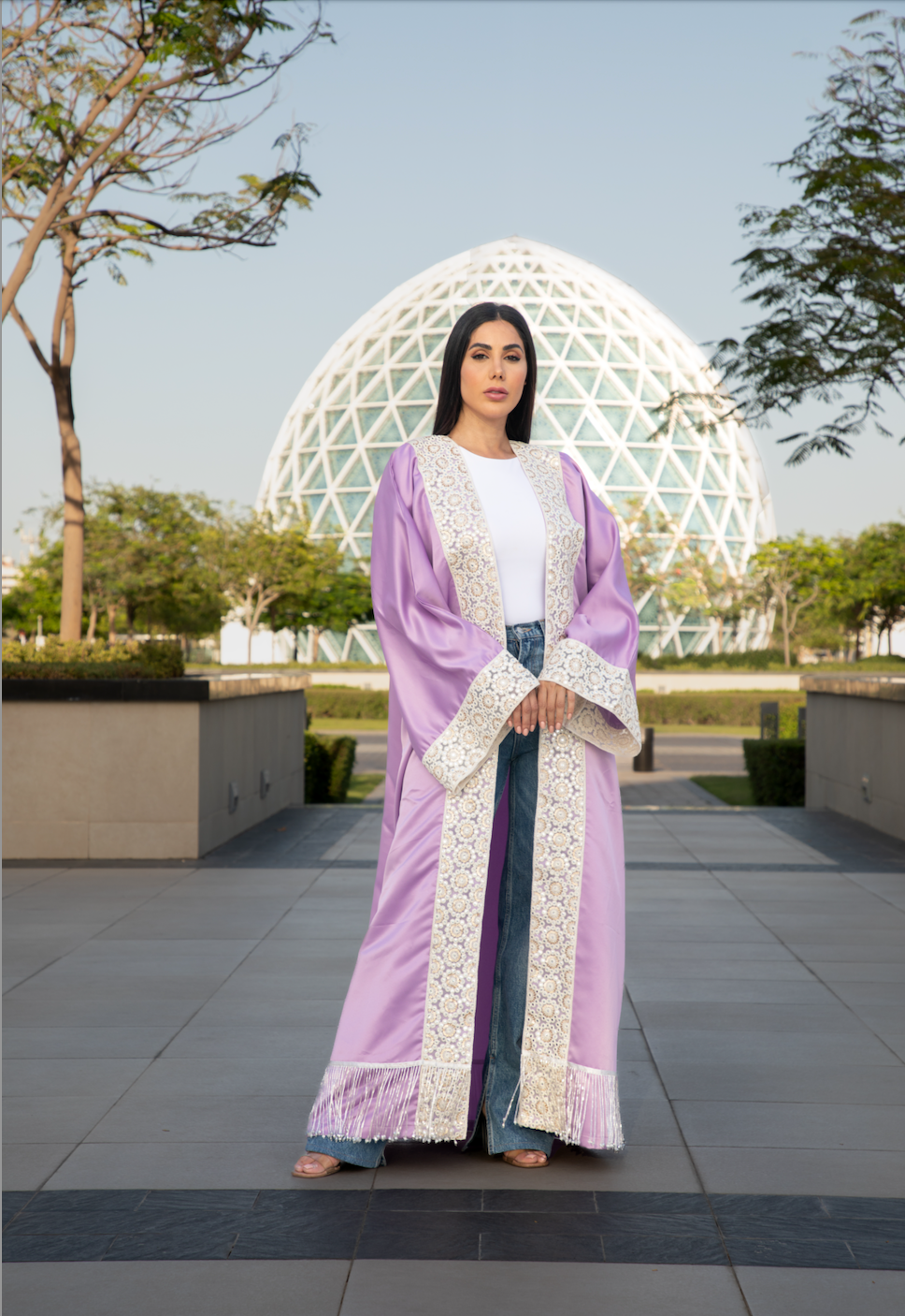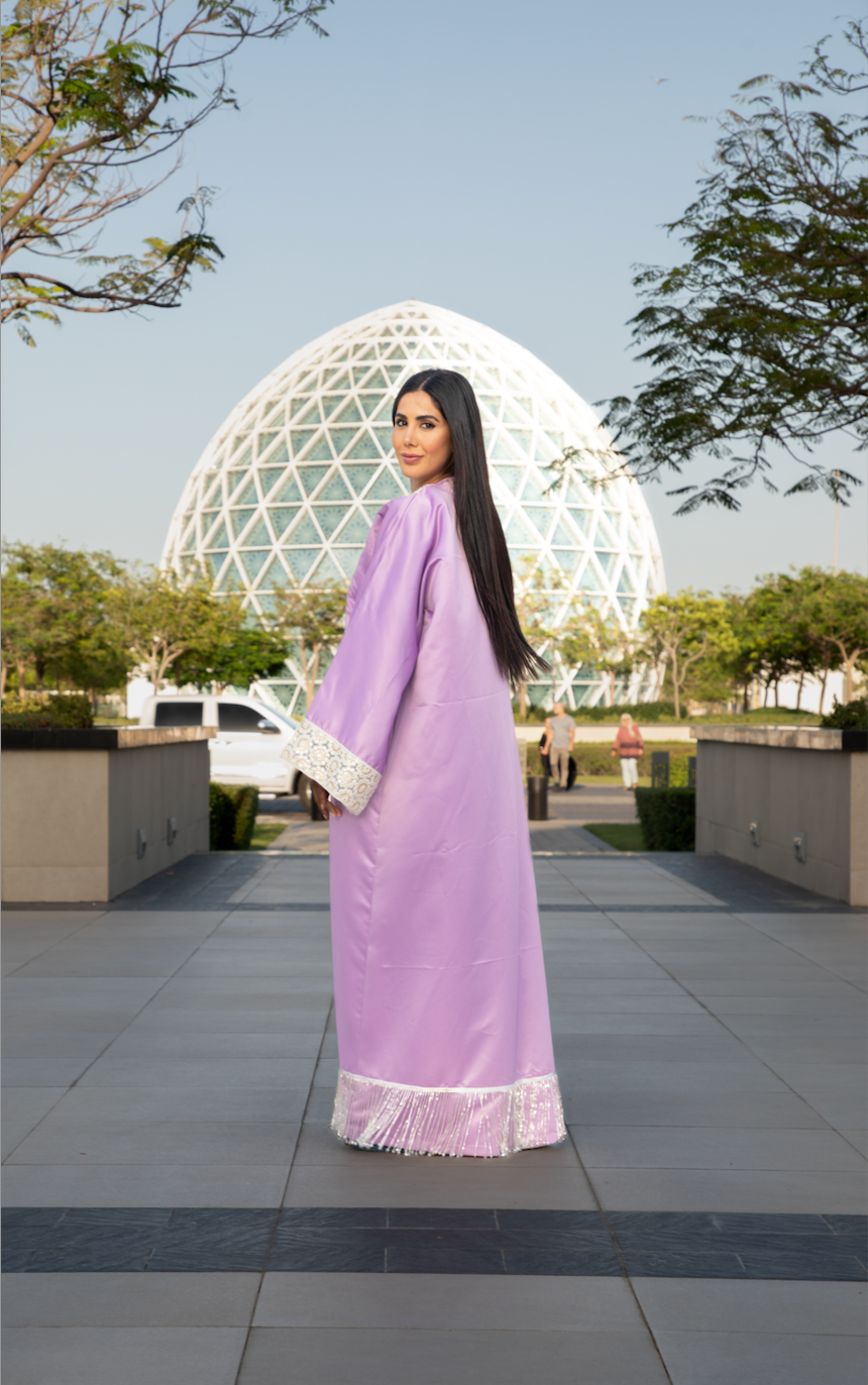 - Product: Lavender Tafta Abaya with belt and tassel details
