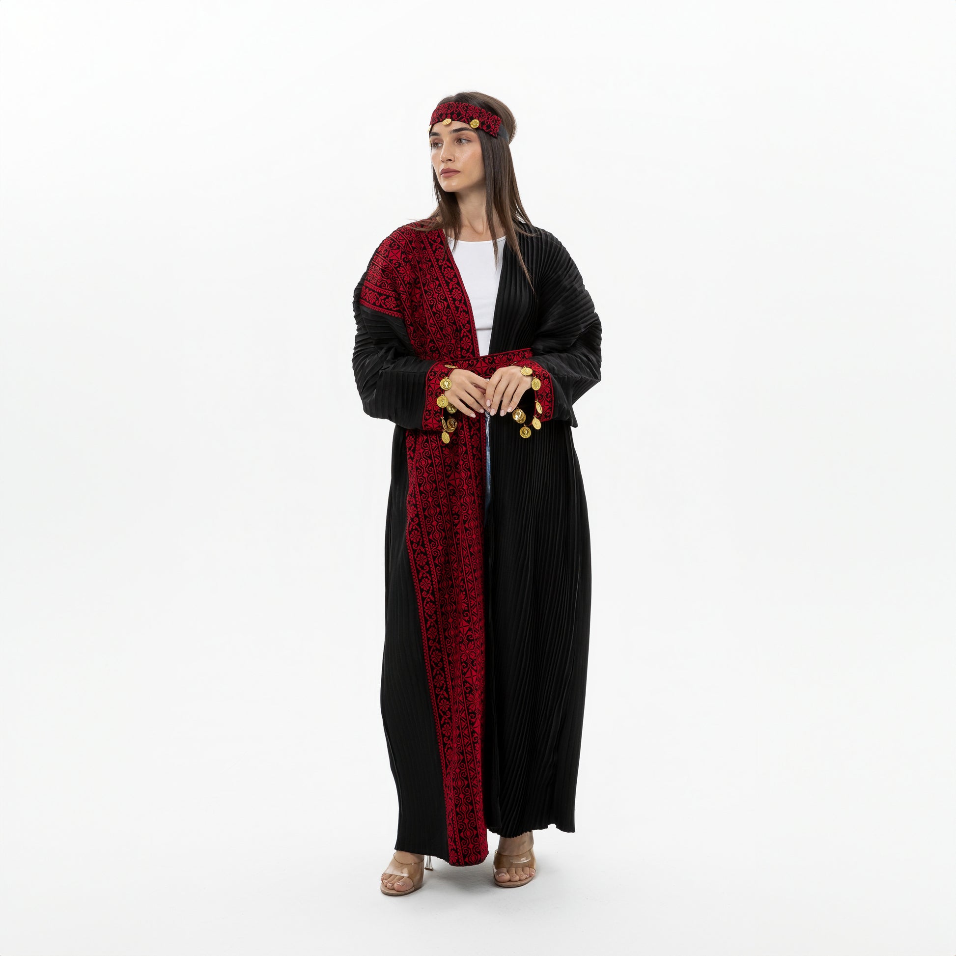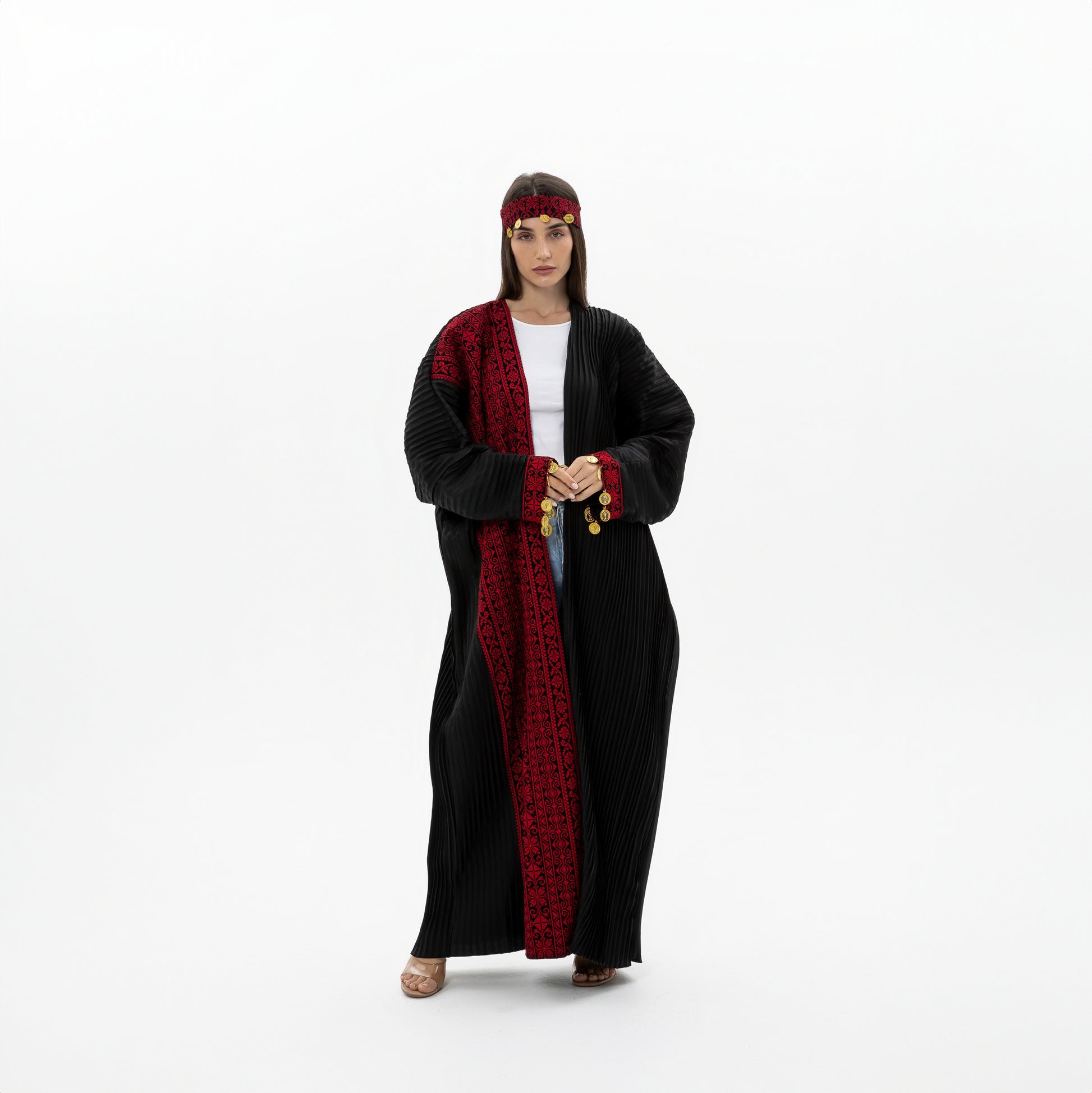 - Product: pleated black abaya with red embroidery and coins