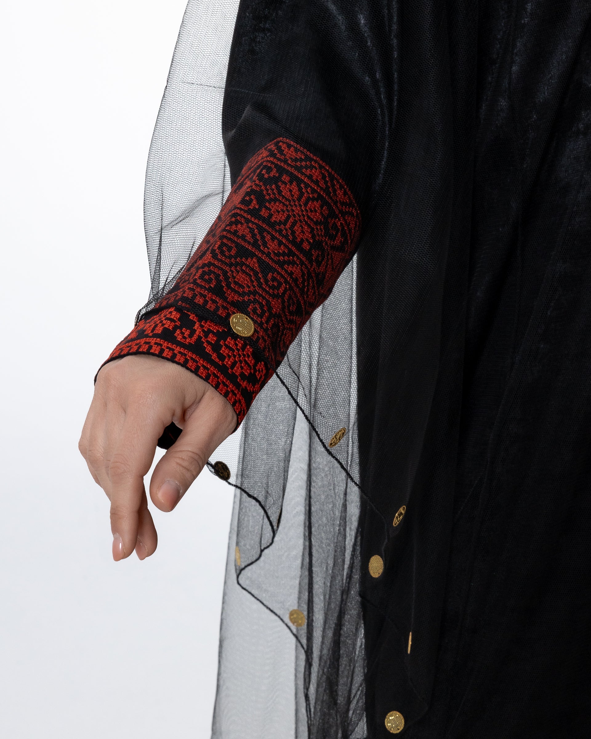- Product: Black kaftan with sheer overlay, red embroidery and coins details