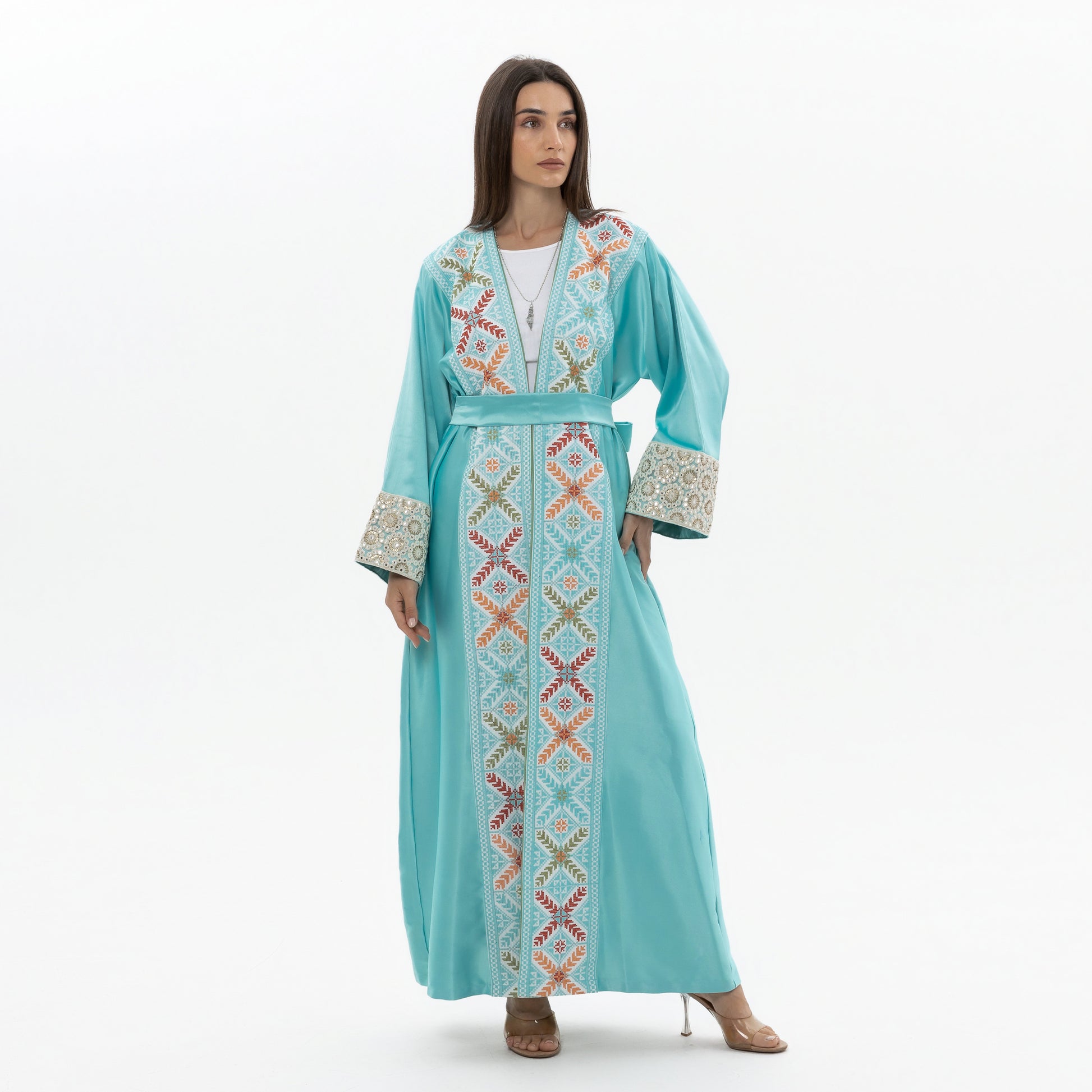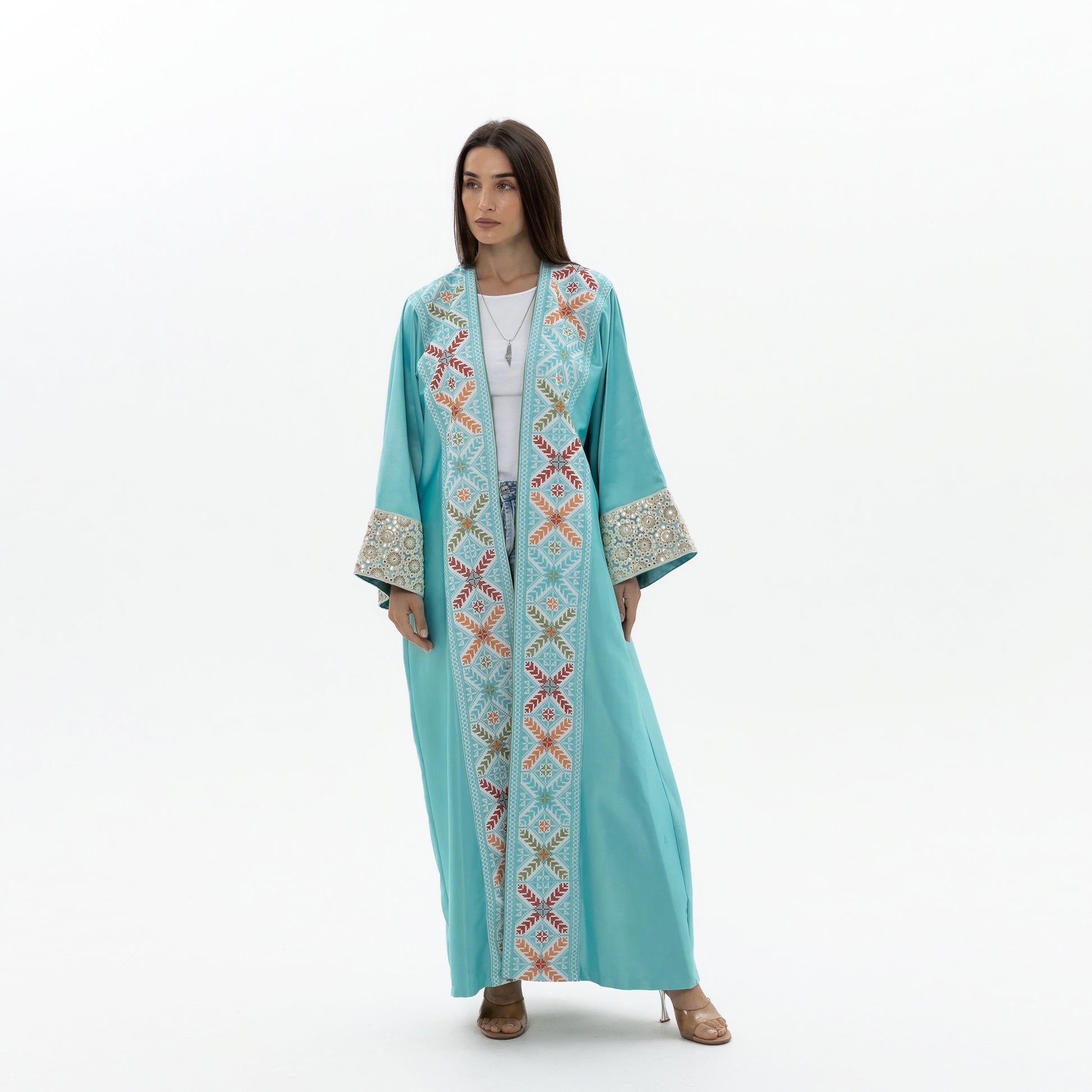 - Product: Blue abaya with colorful tatreez