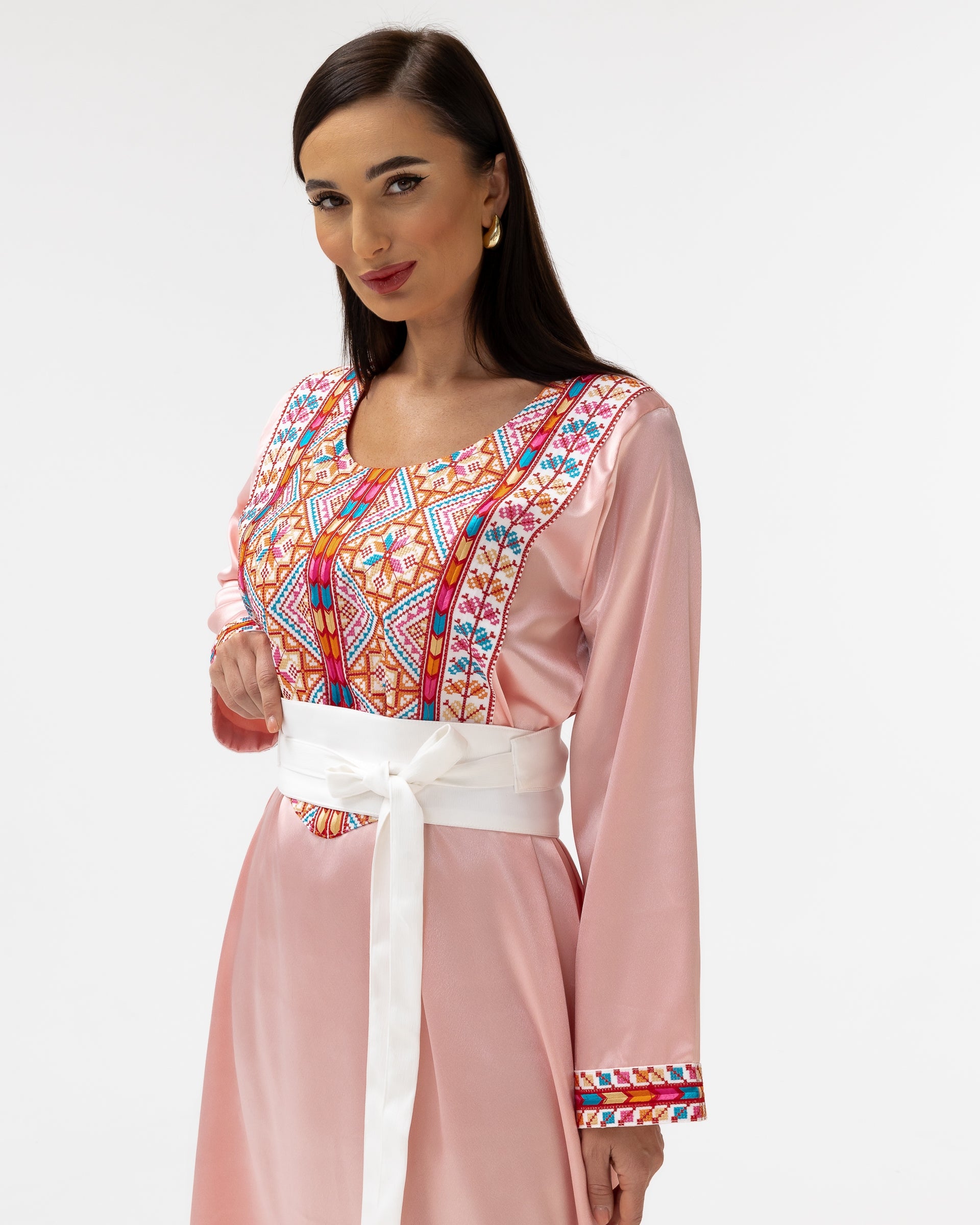 - Product: Soft blush kaftan with multicolored geometric embroidery details