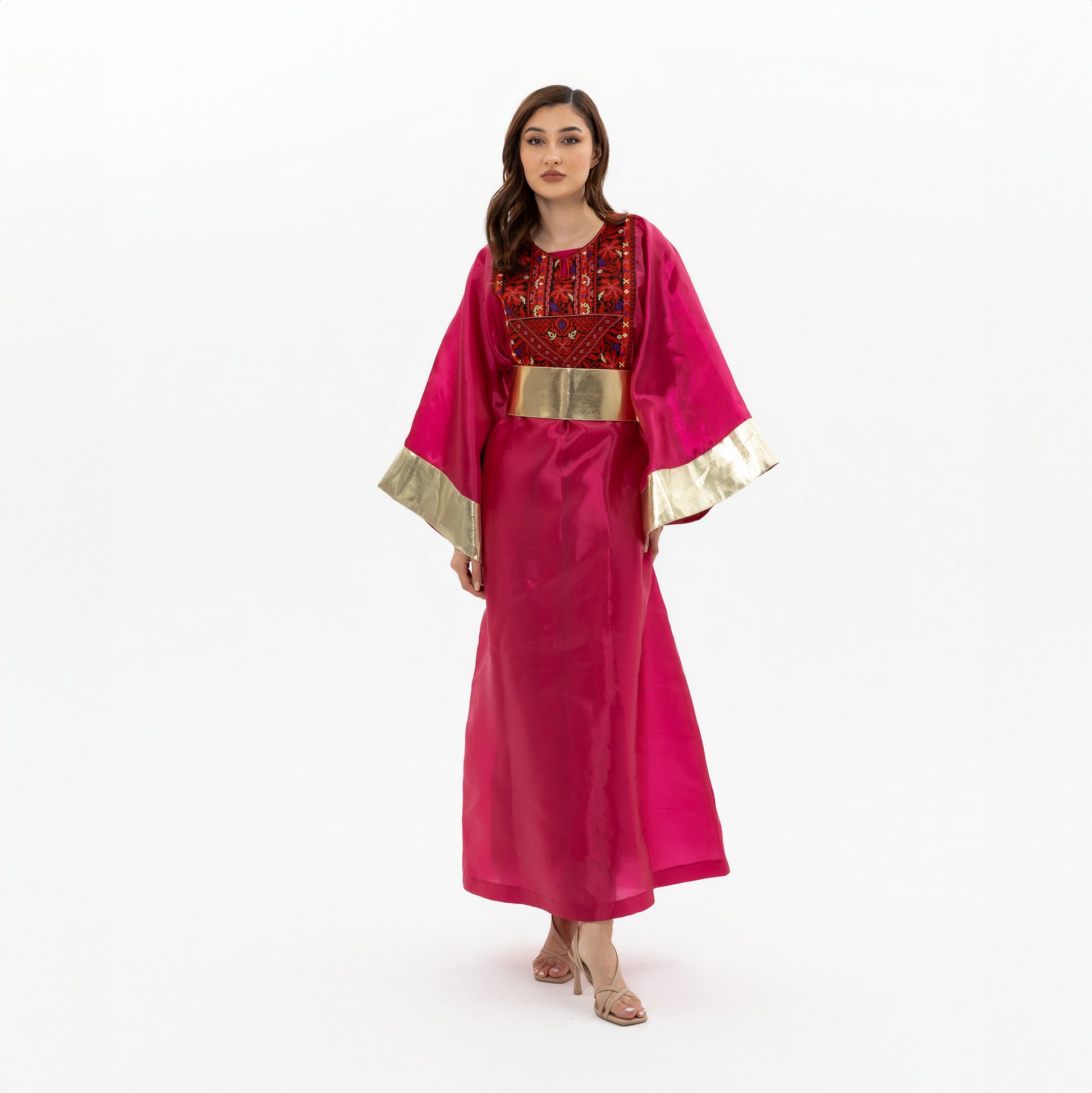 - Product: Hot pink dress with red Palestinian tatreez, gold cuffs and gold-colored belt