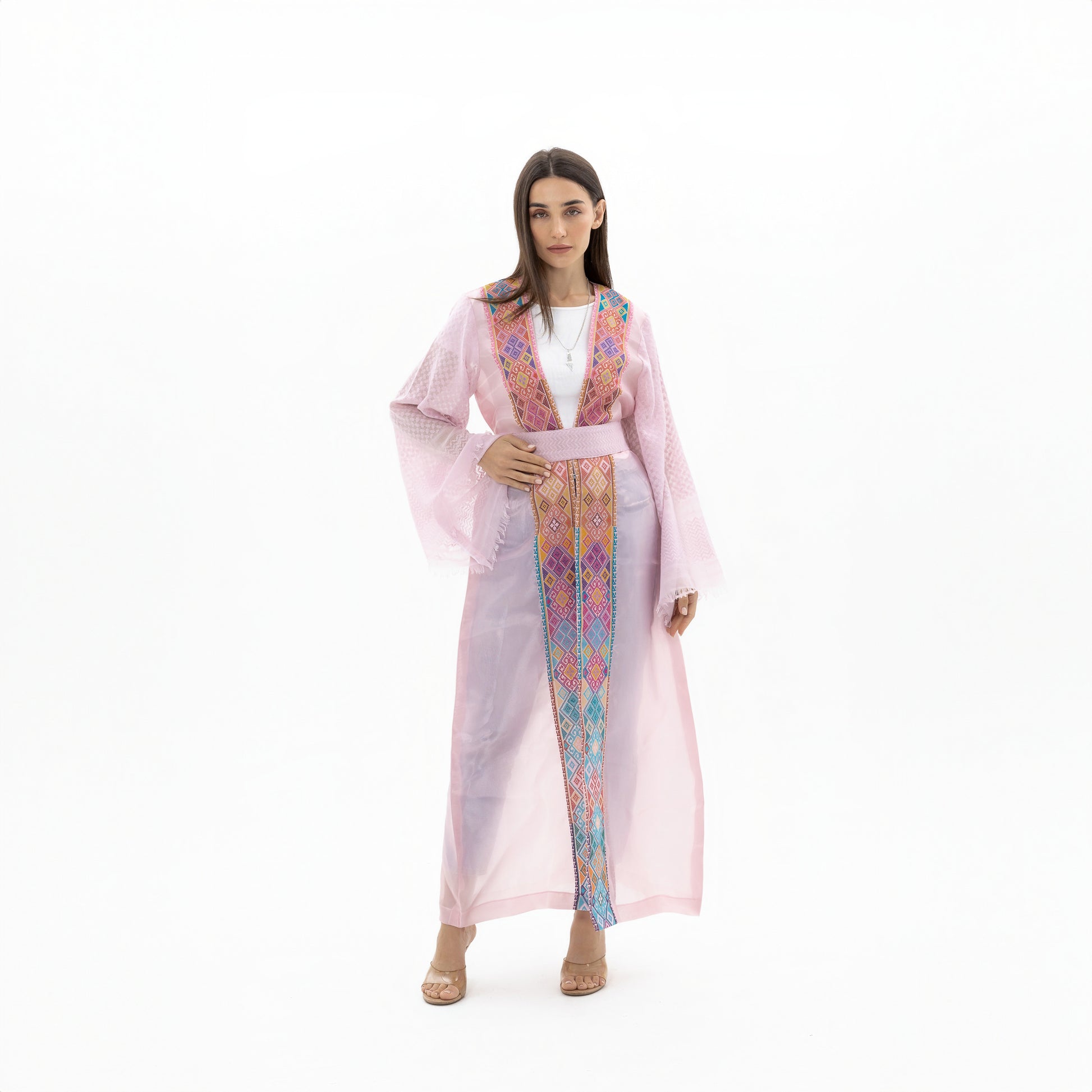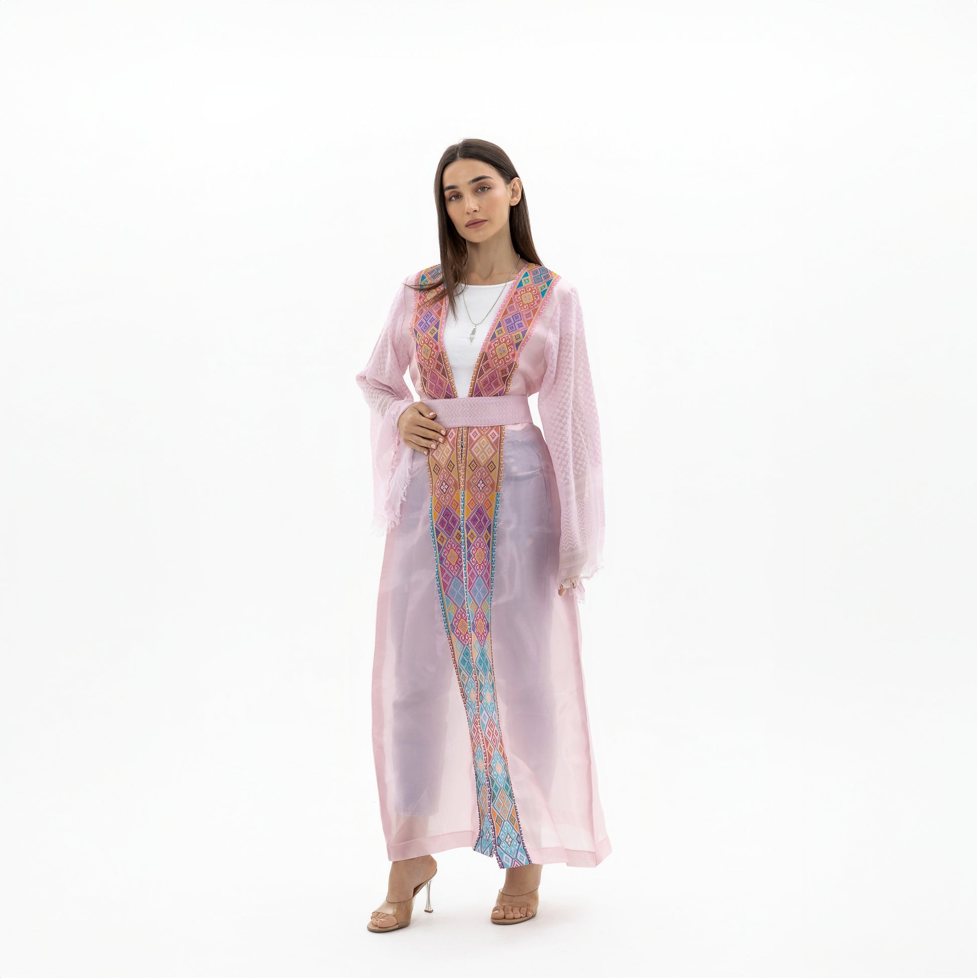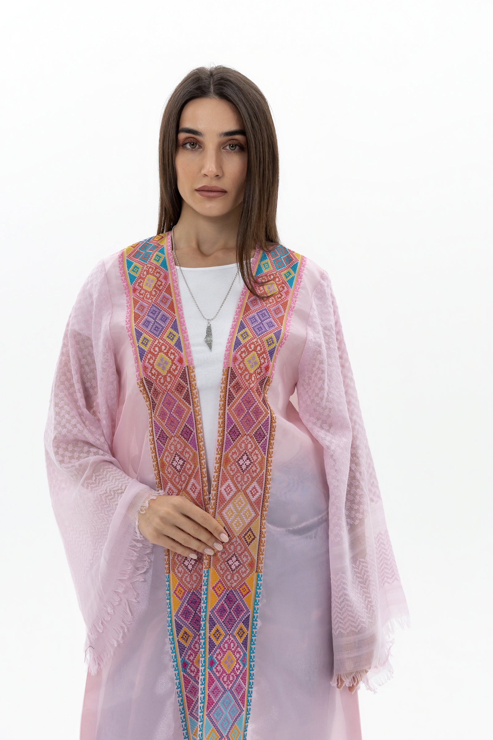 - Product: Light pink abaya with Tatreez details and Keffiyeh sleeves