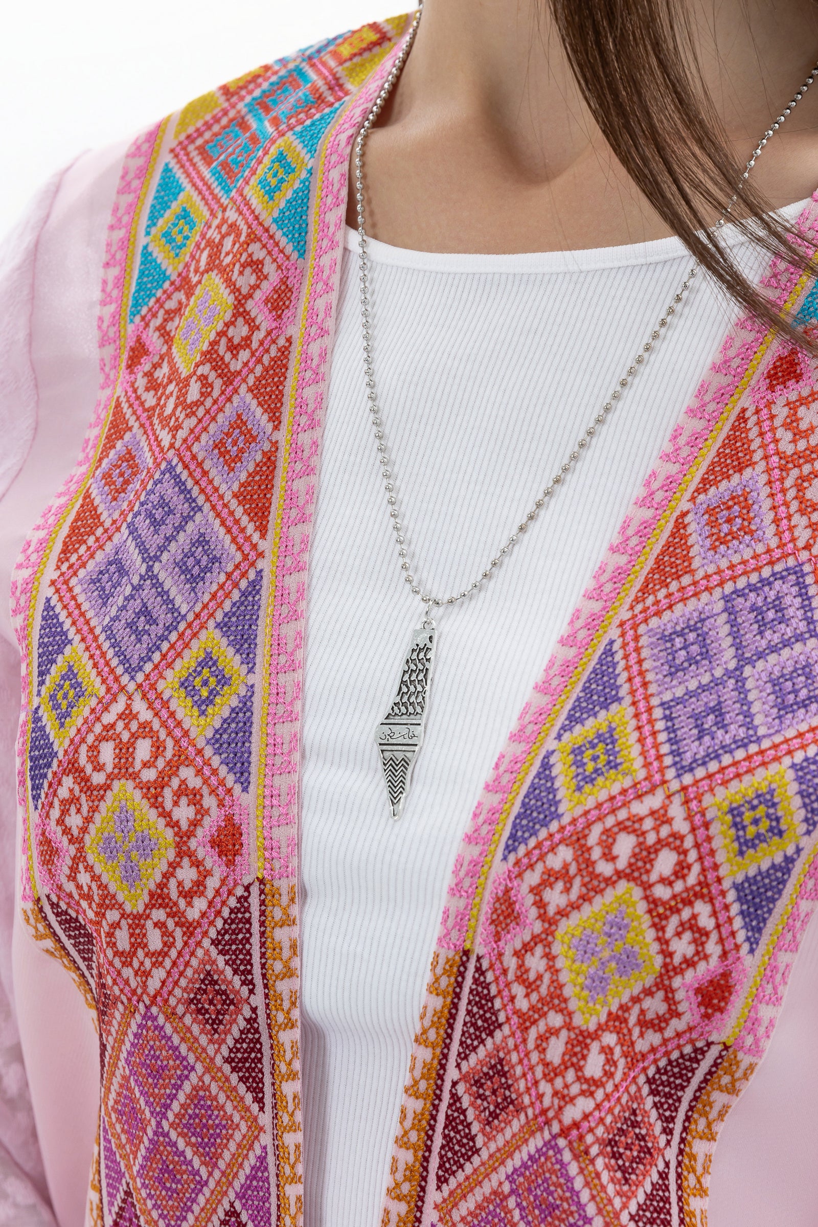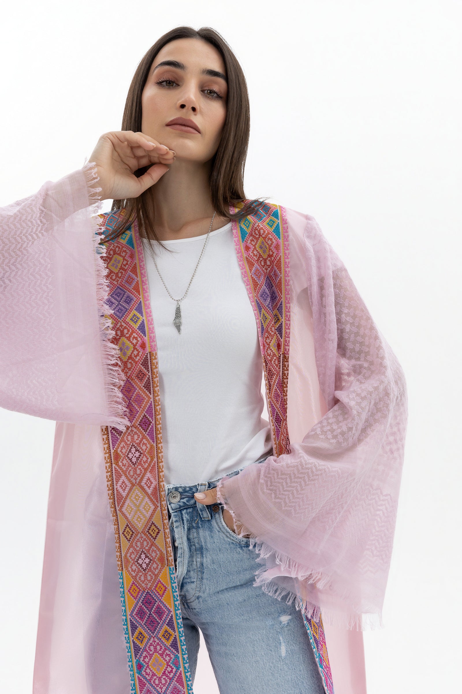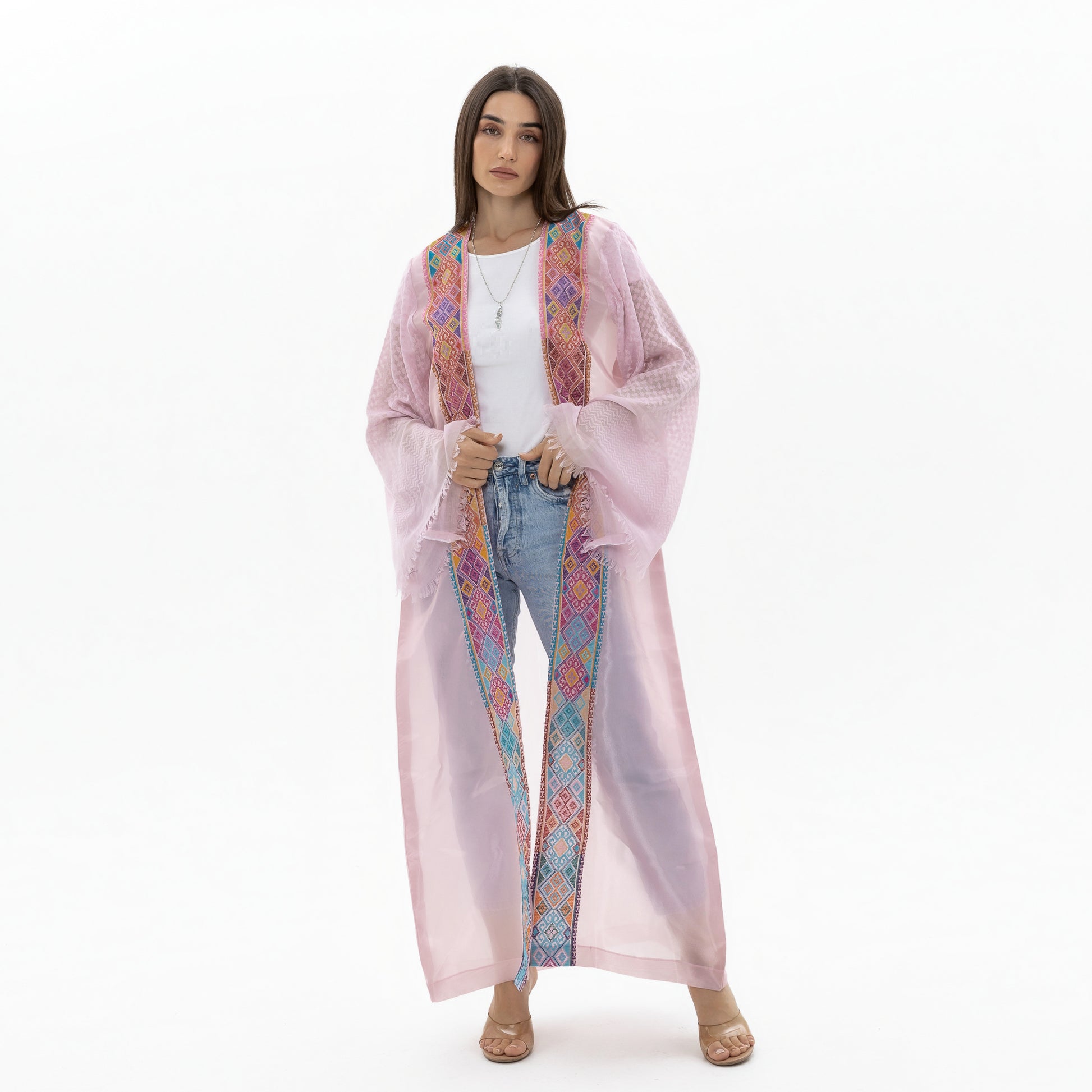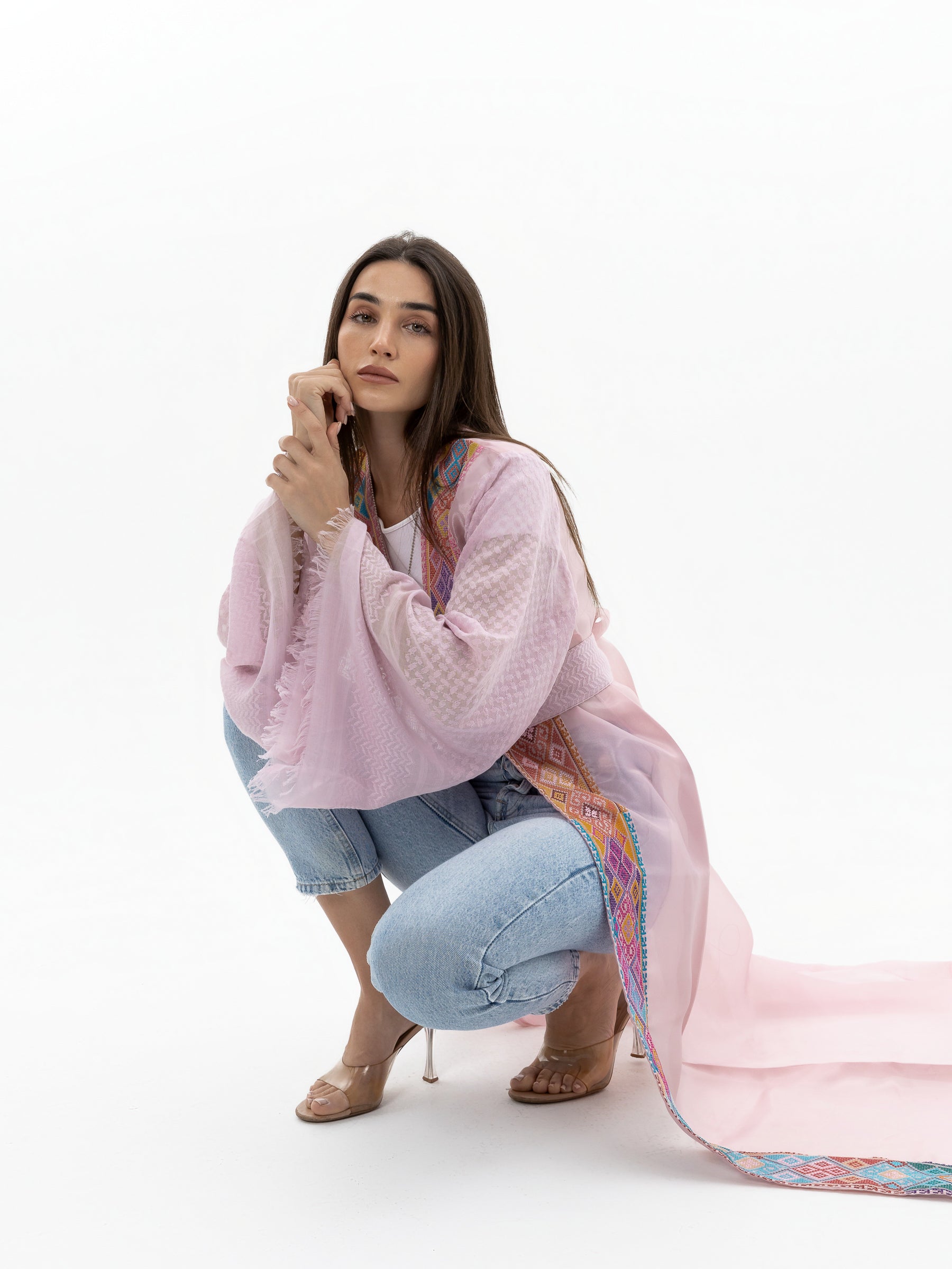 - Product: Light pink abaya with Tatreez details and Keffiyeh sleeves