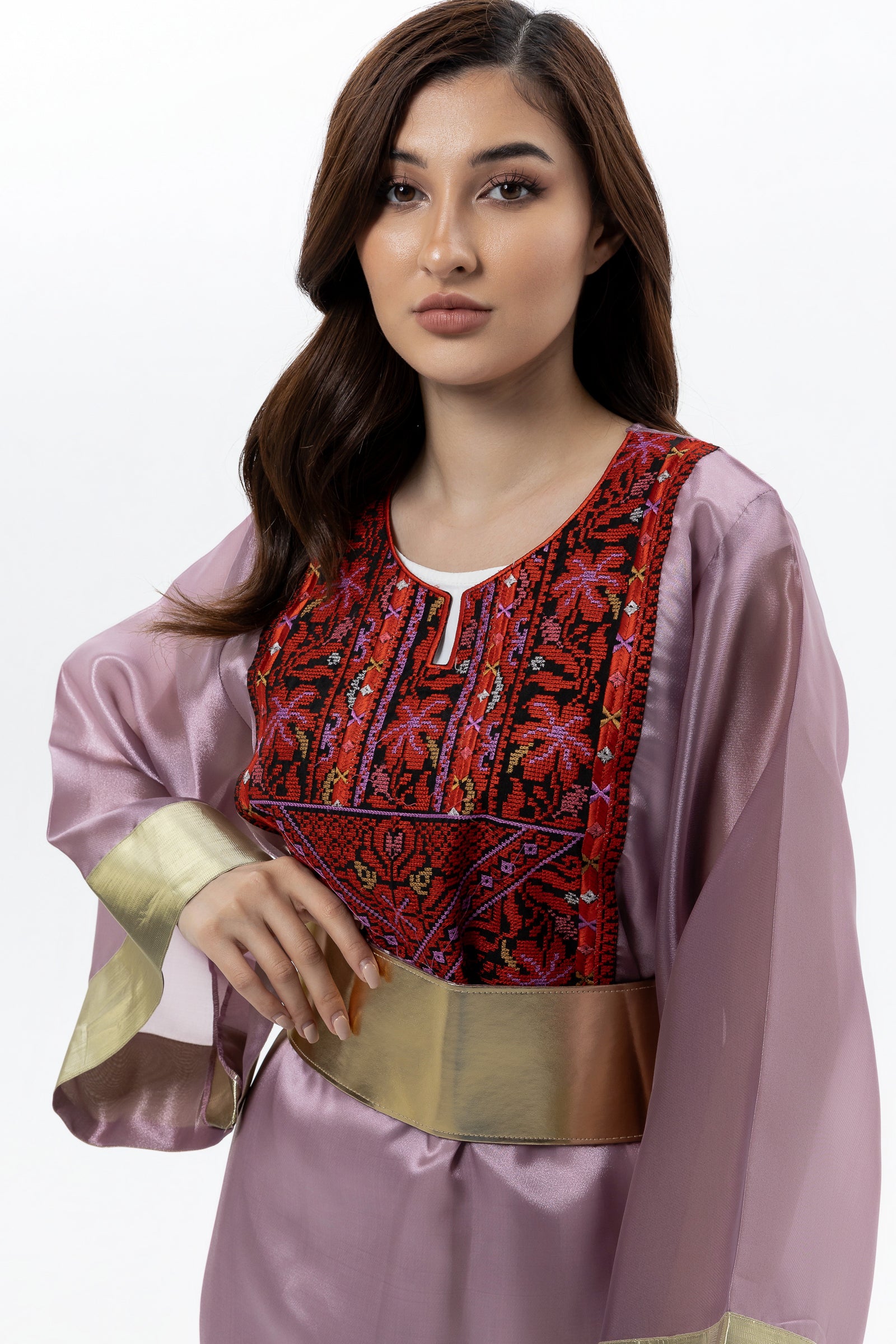 - Product: Mauve dress with red Palestinian tatreez, gold cuffs and gold-colored belt