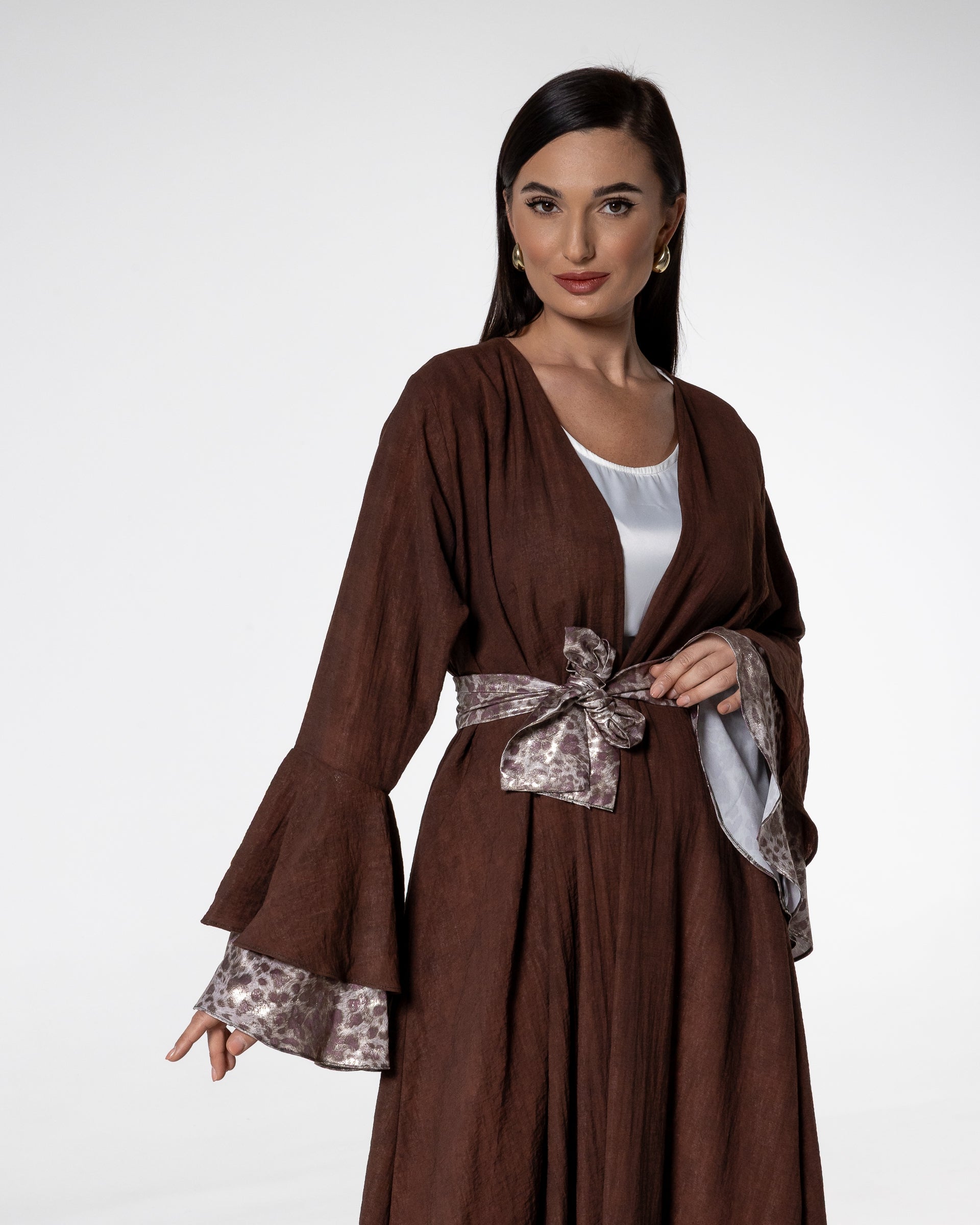 - Product: Rich chocolate brown open abaya with subtle satin leopard-print accents on the cuffs and belt