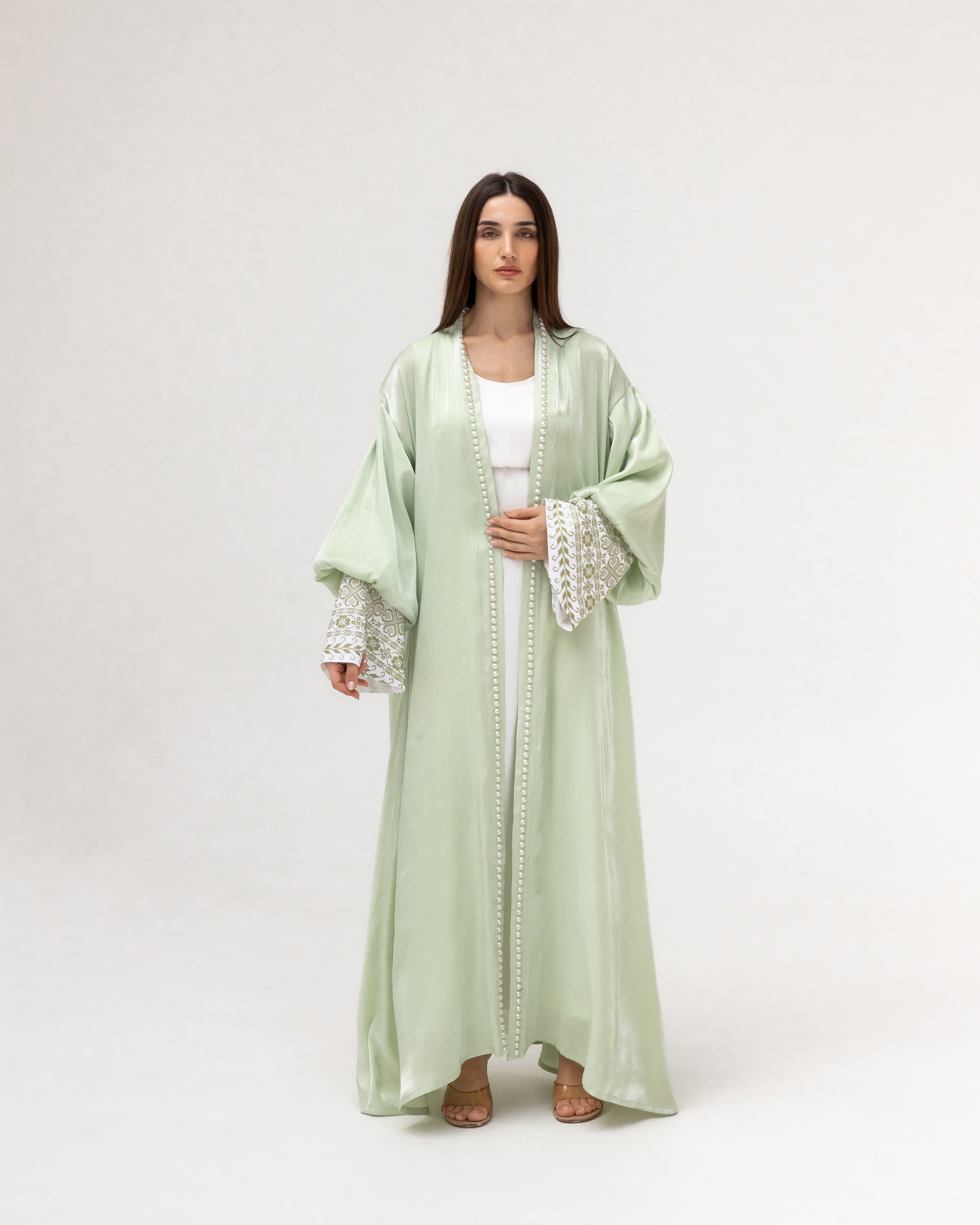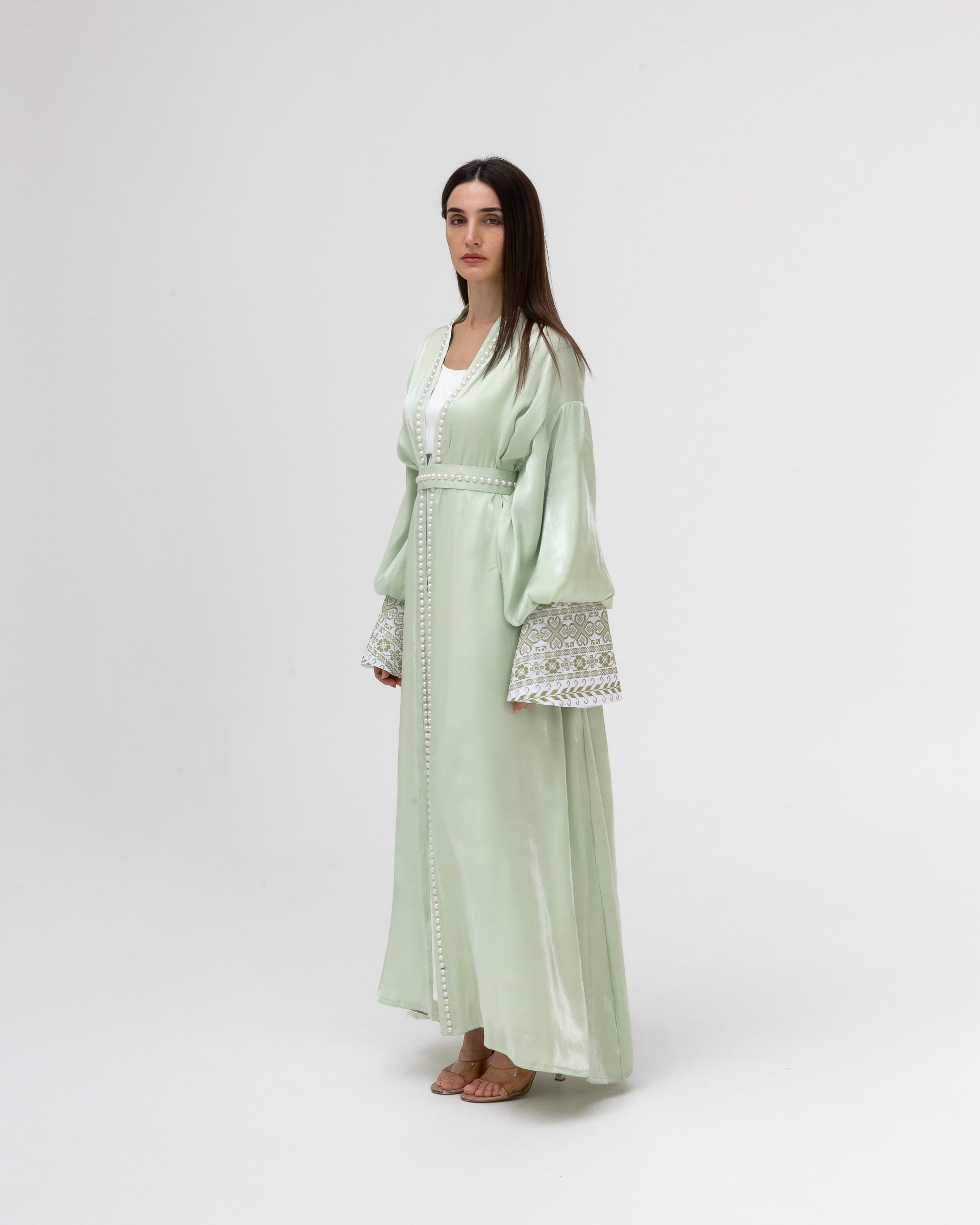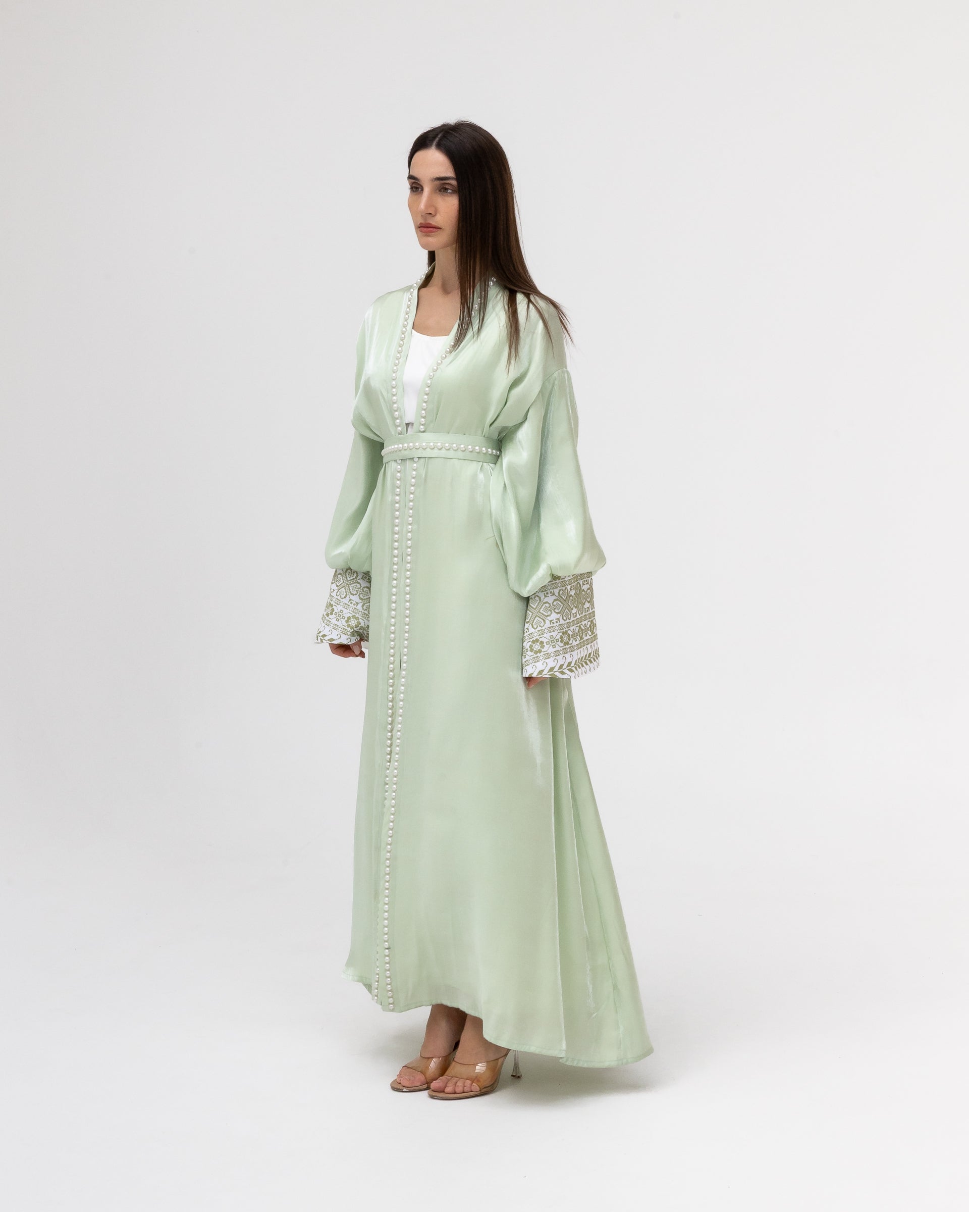 - Product: Pastel green abaya with pearls and embroidery