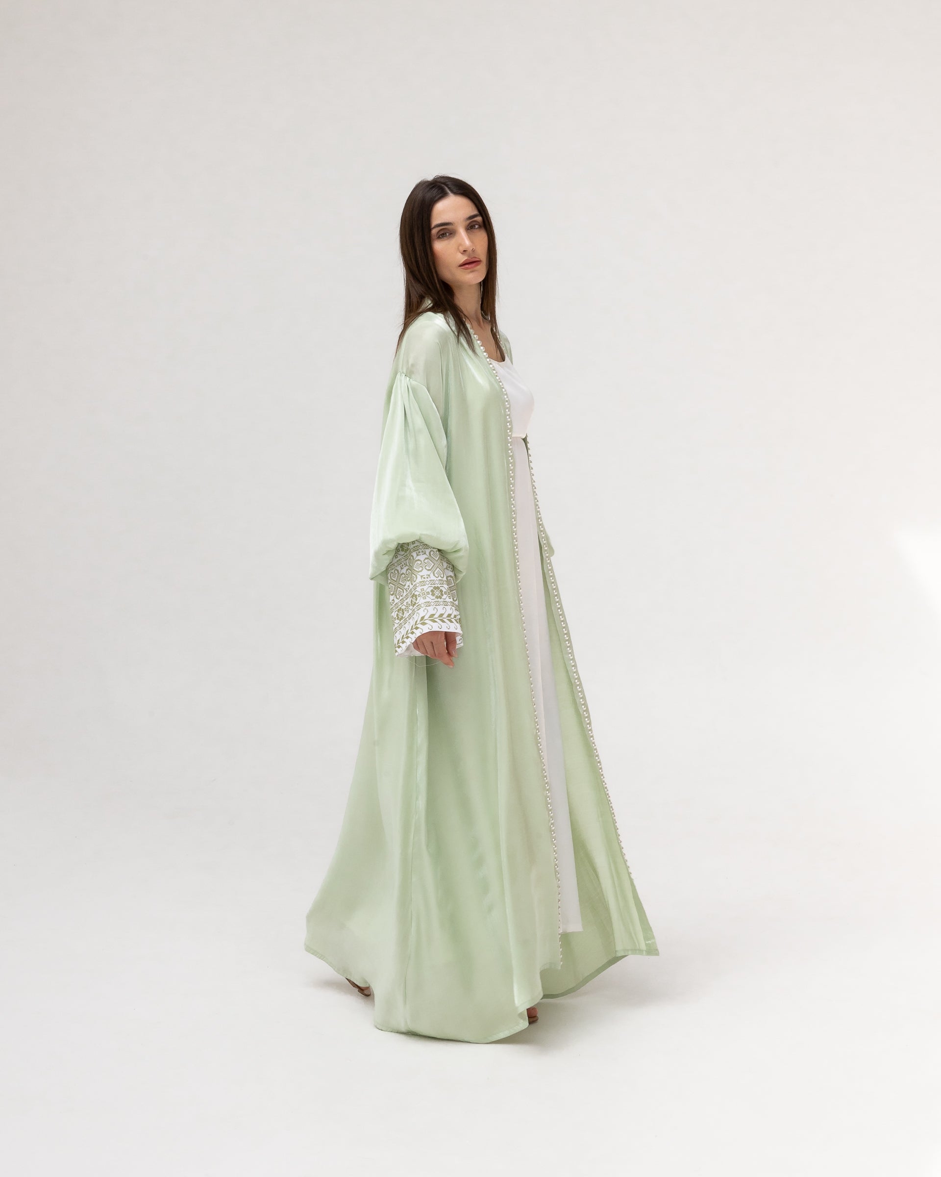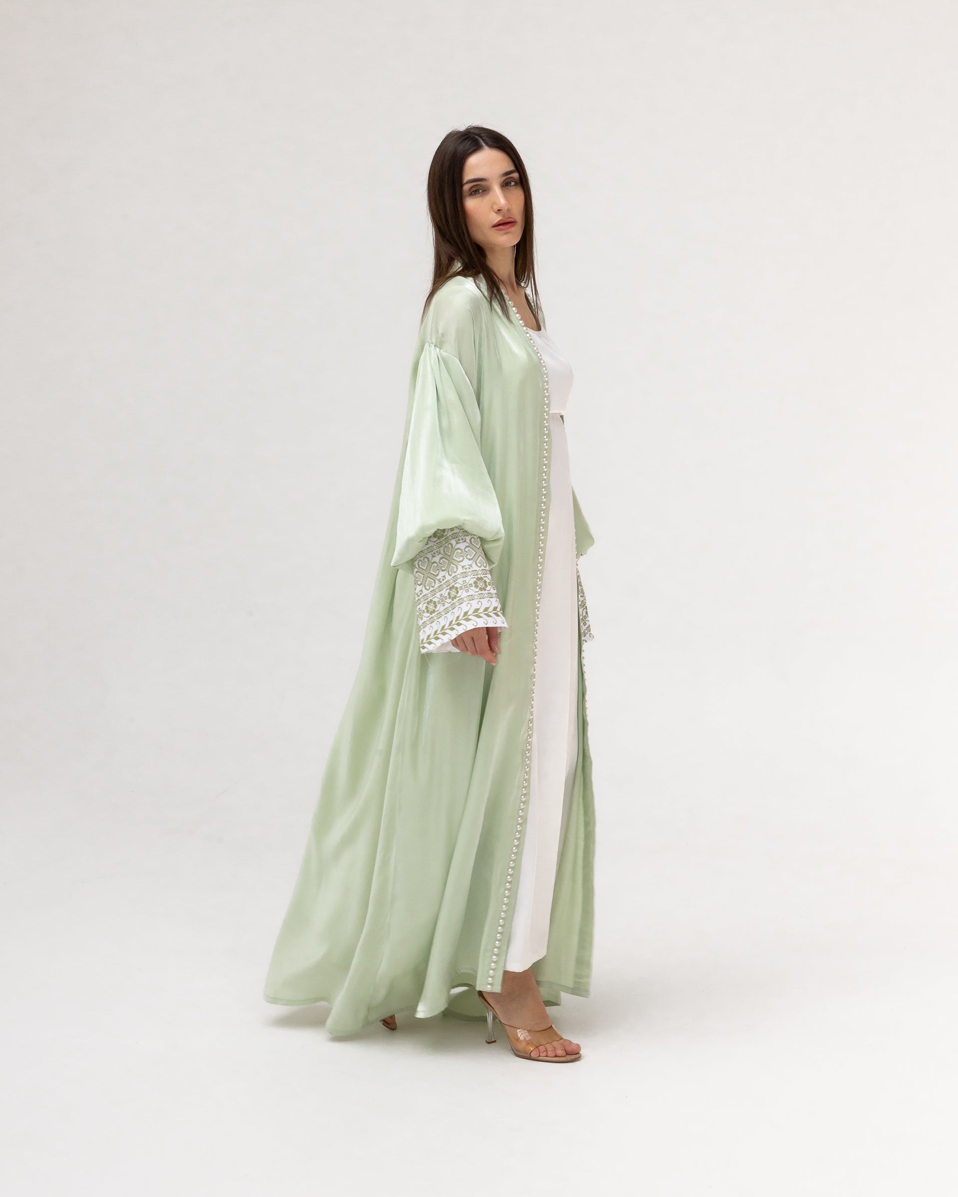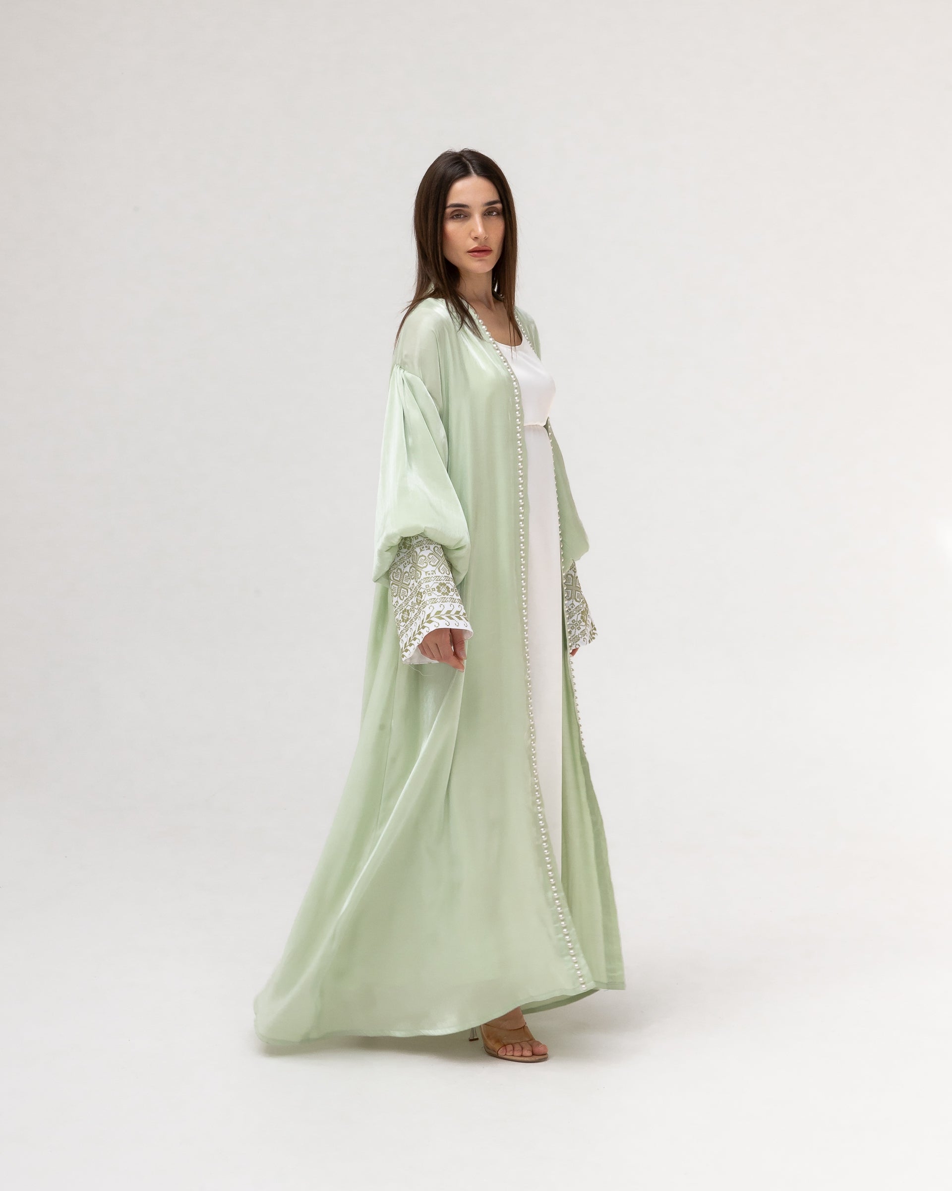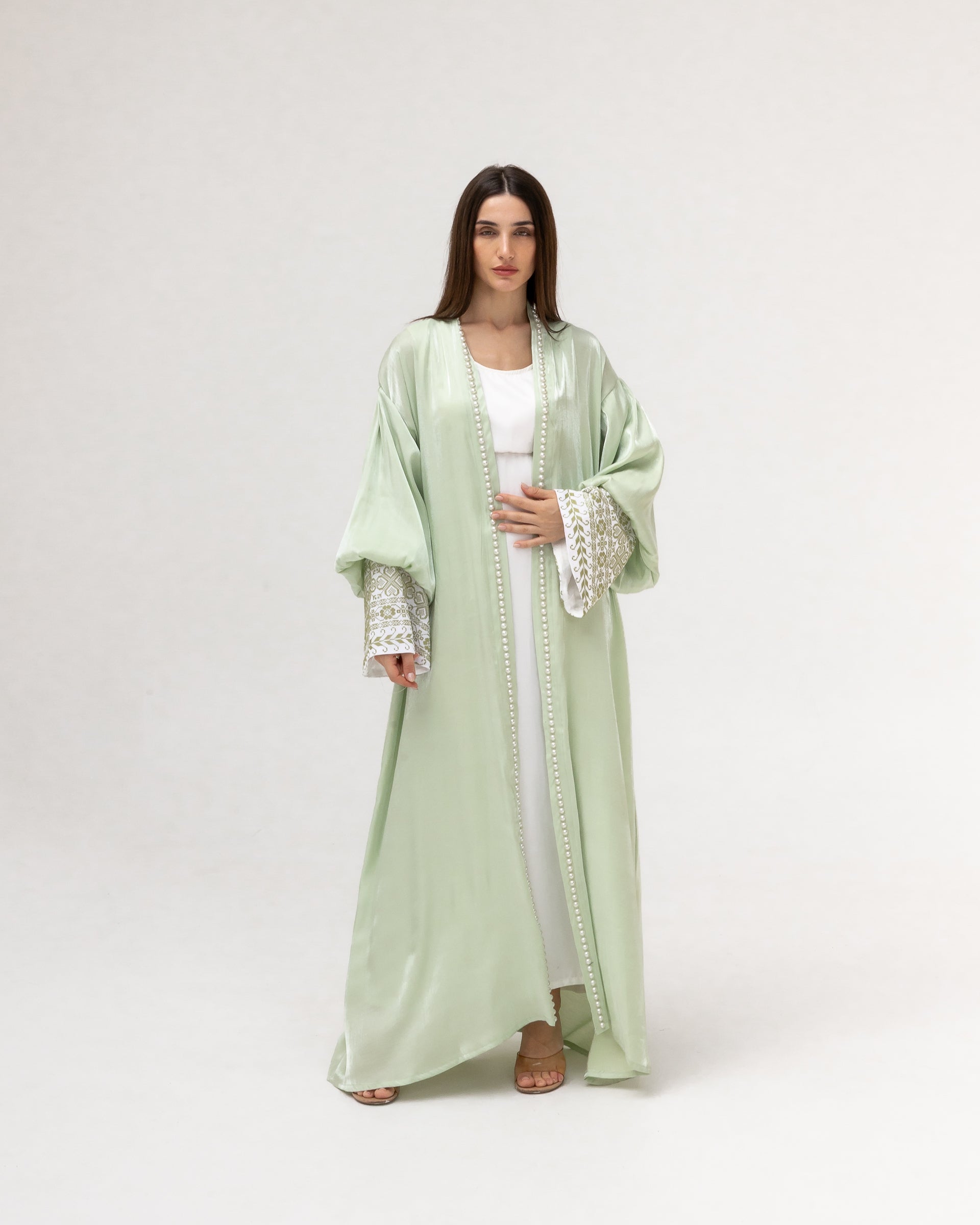 - Product: Pastel green abaya with pearls and embroidery