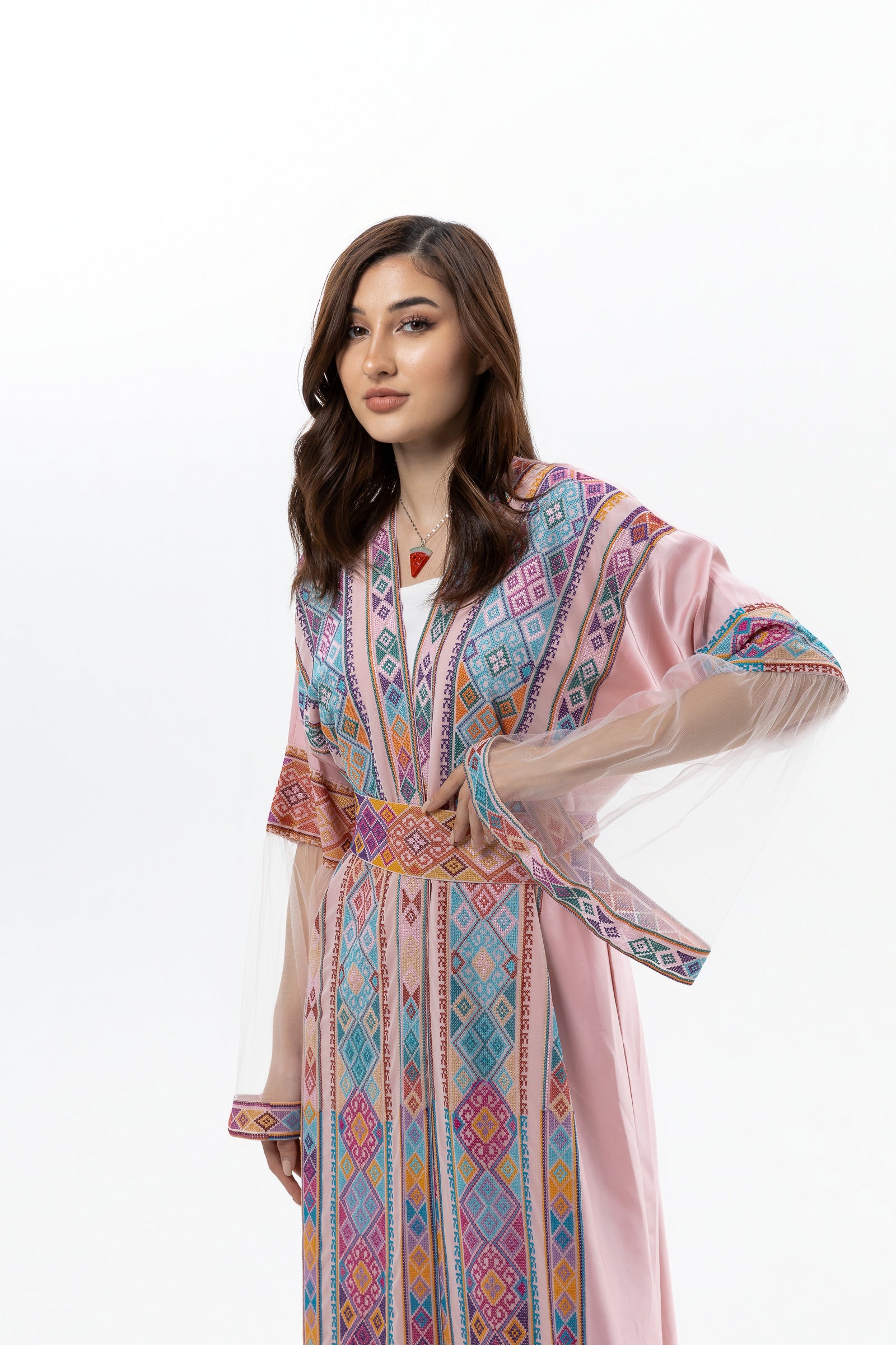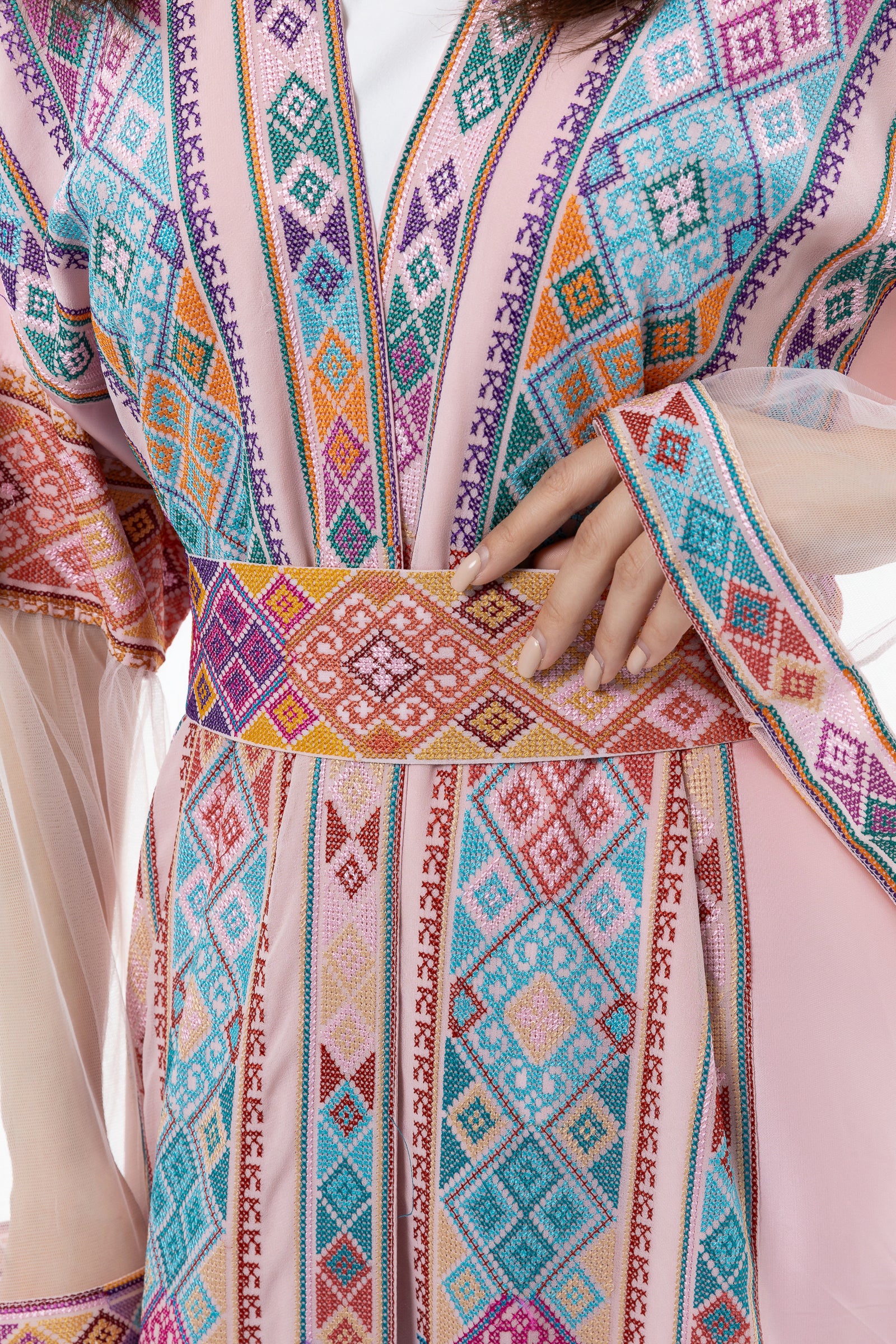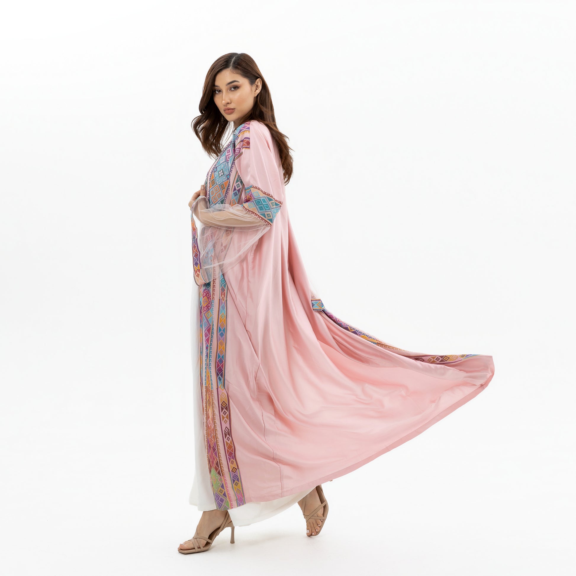 - Product: Pink abaya with colorful tatreez and sleeve details