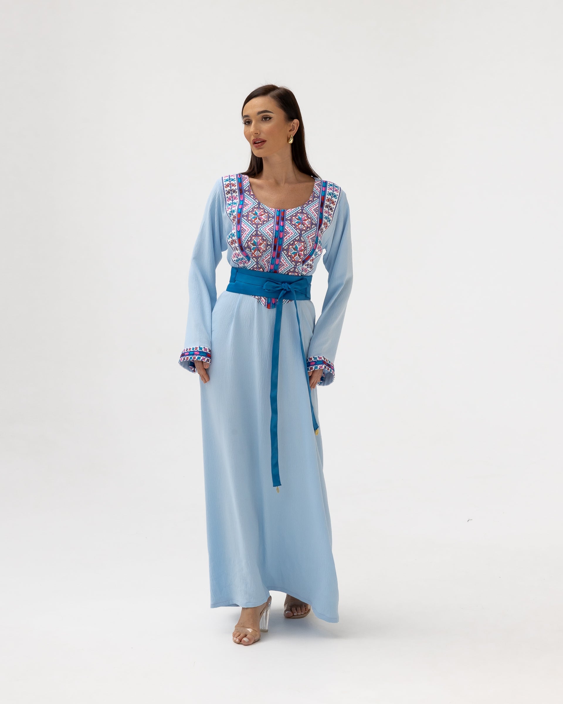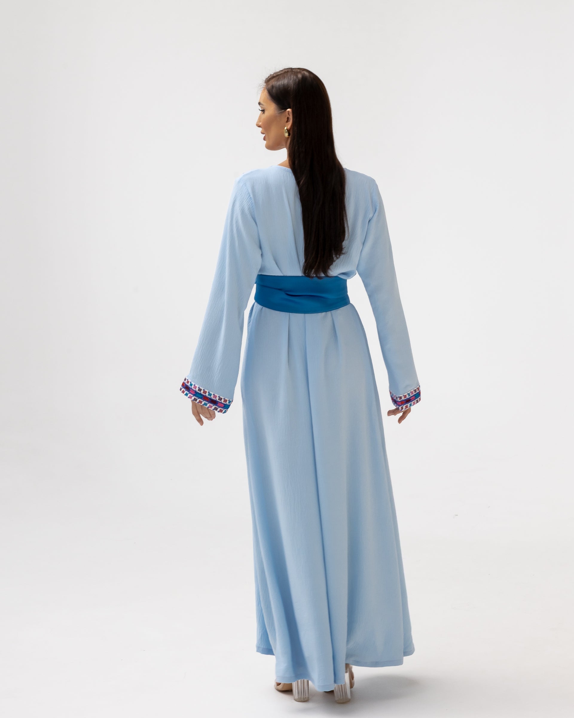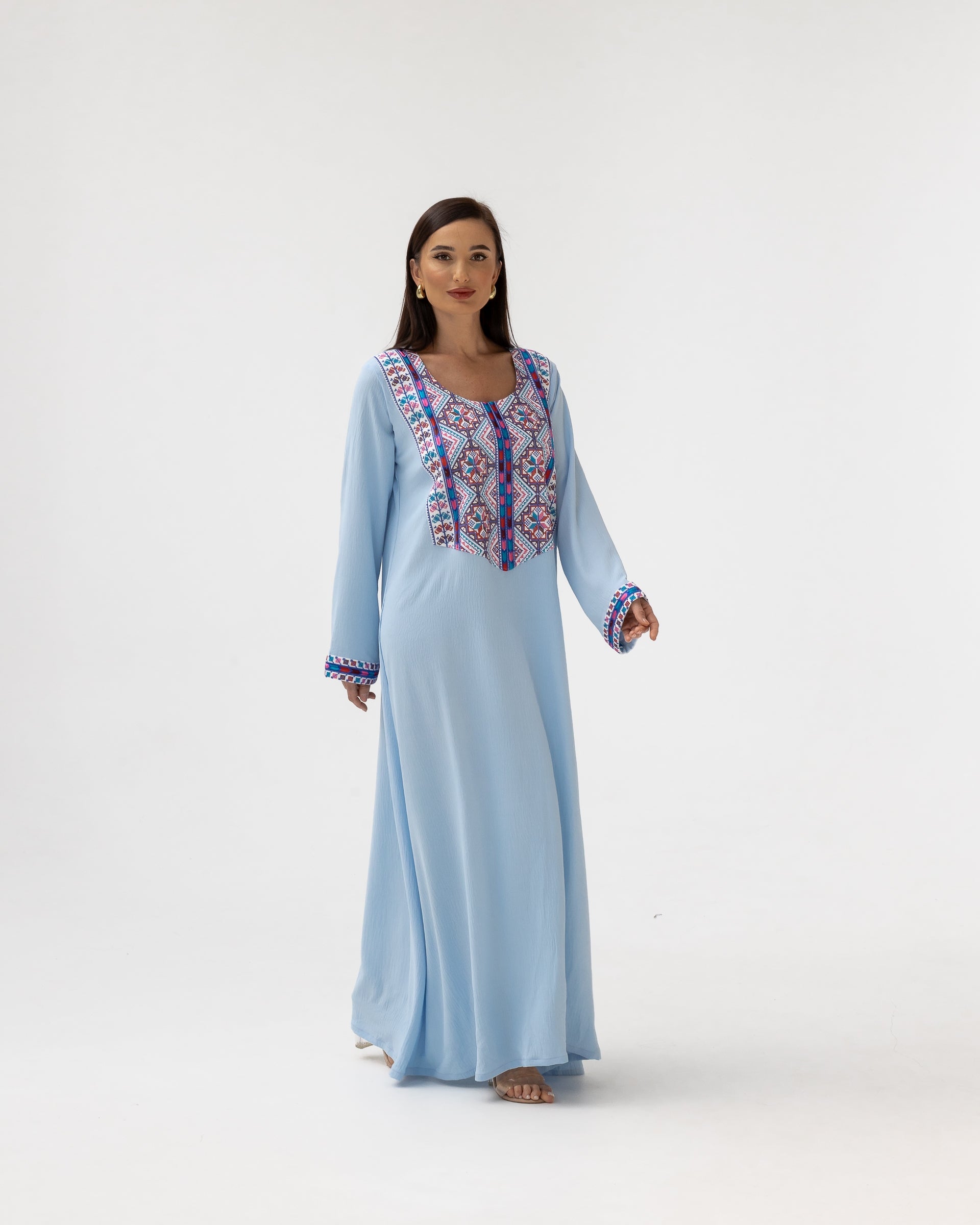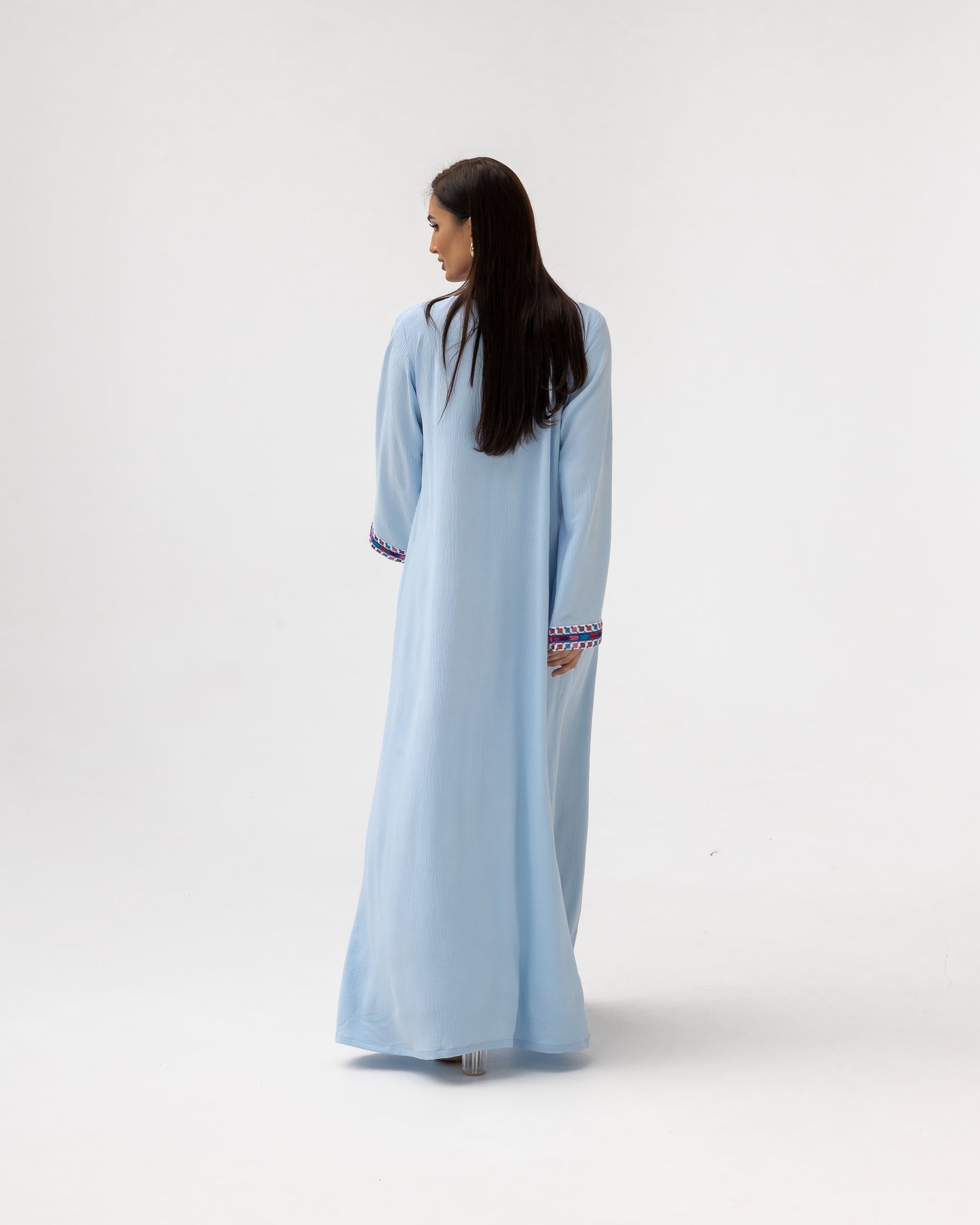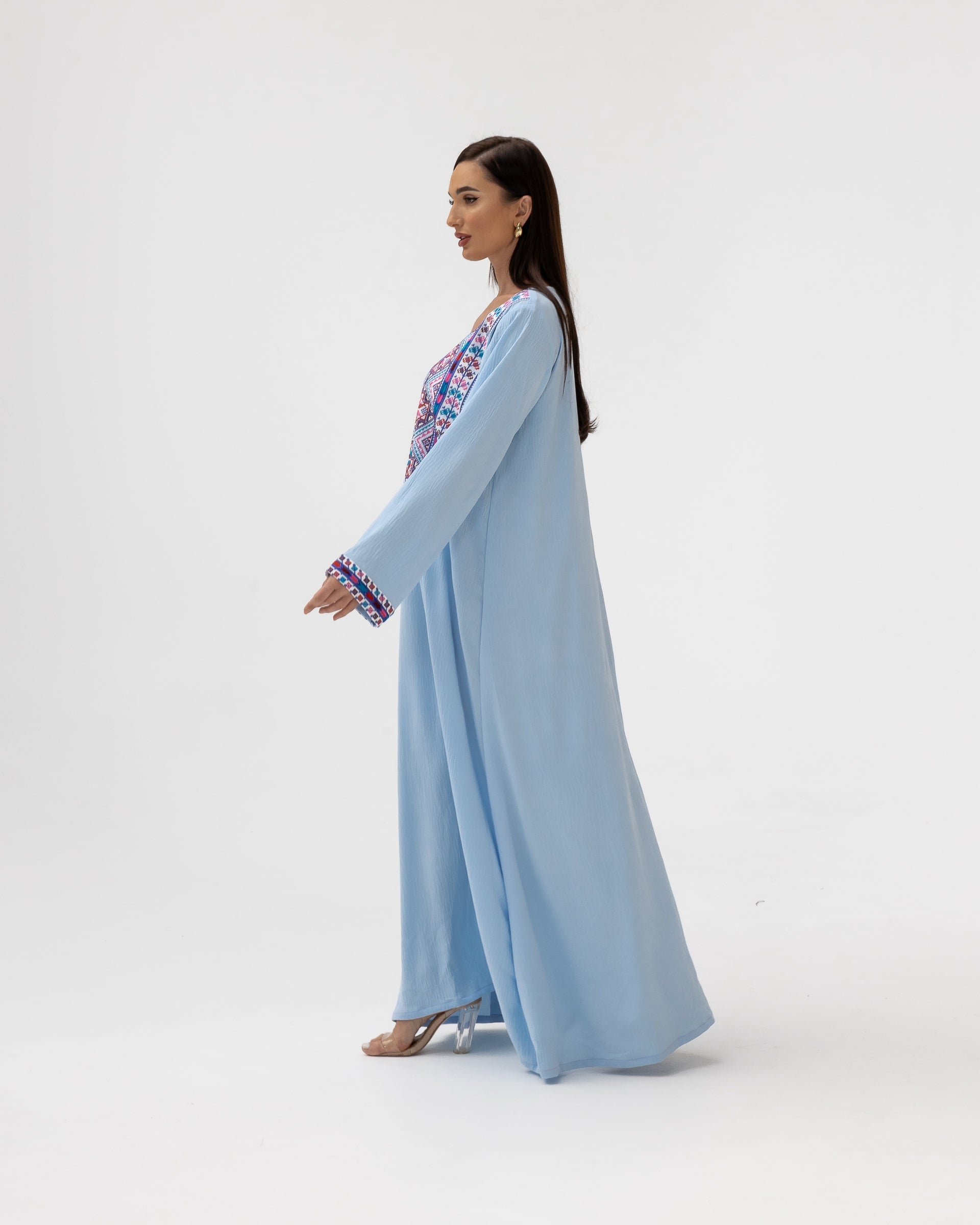 - Product: Sky Blue kaftan with multicolored geometric embroidery details