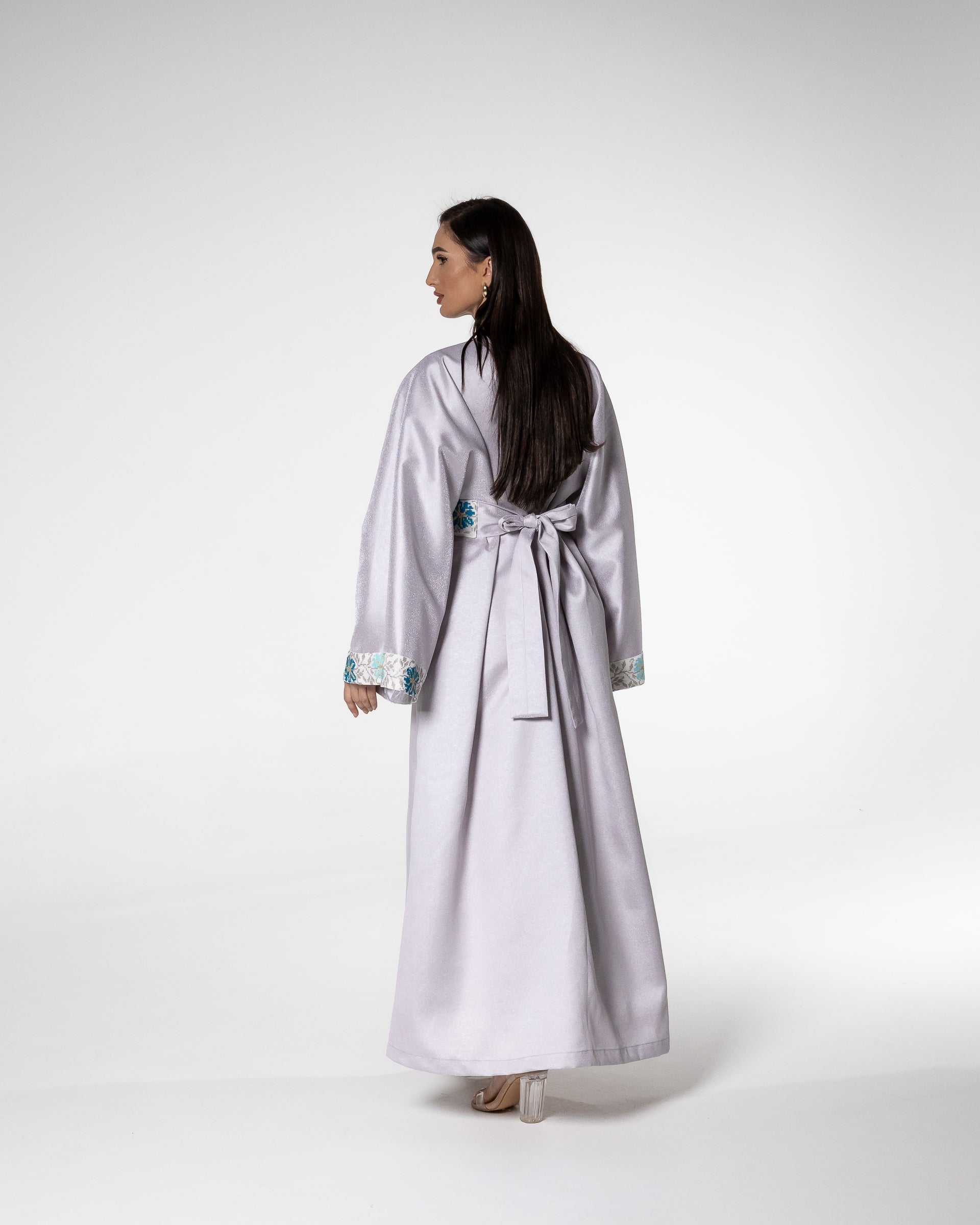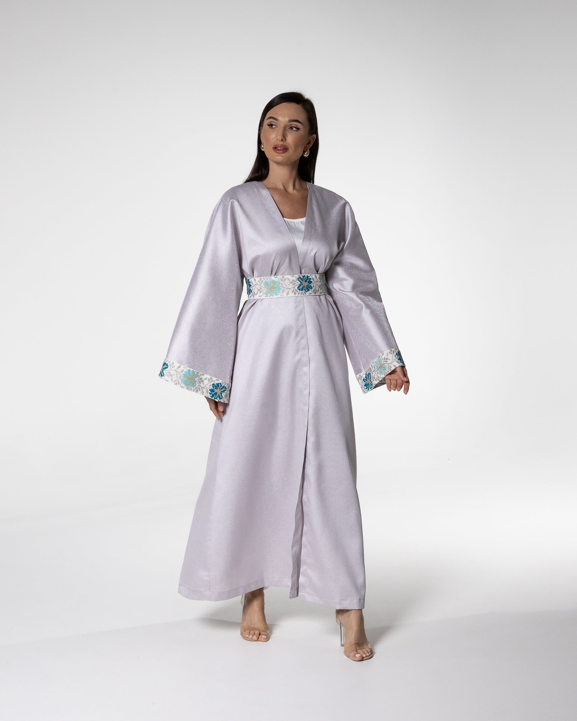 - Product: Soft lavender abaya with floral embroidery on the wide cuffs and belt